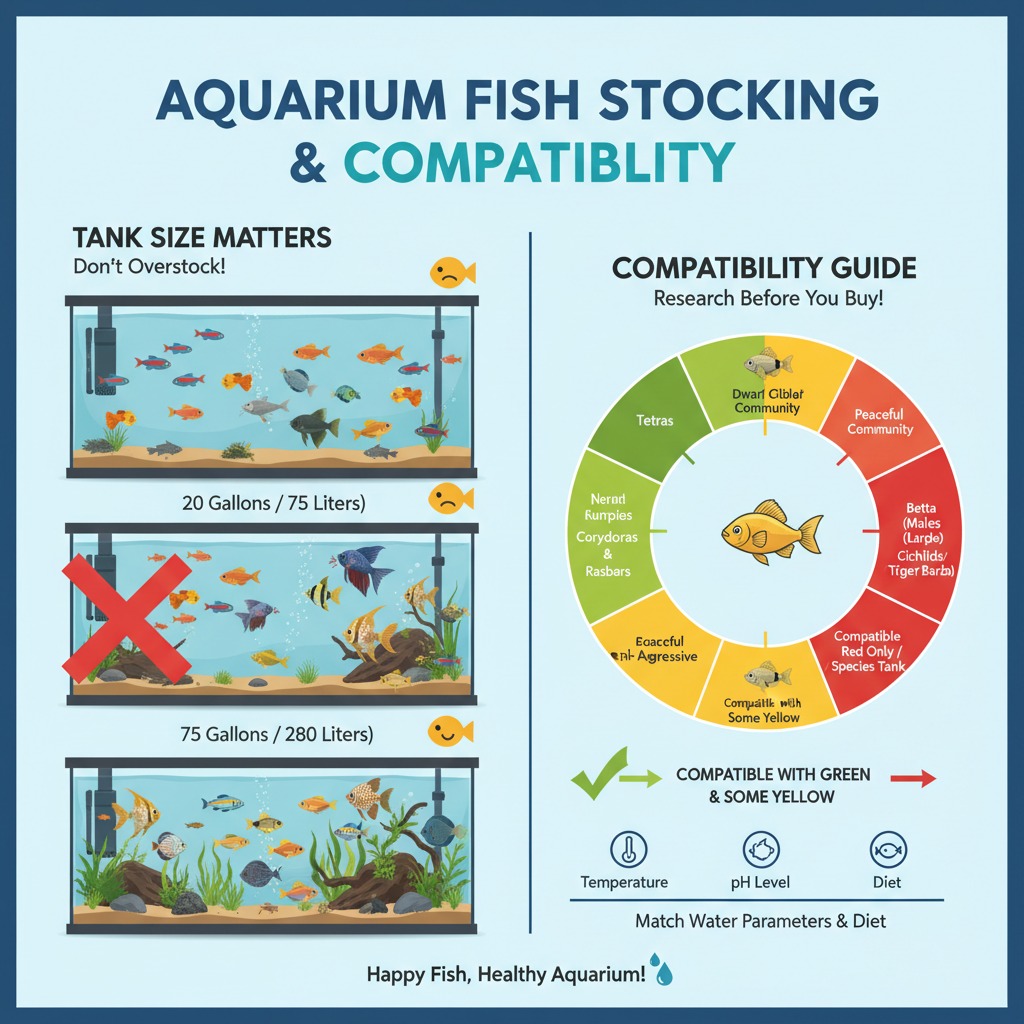 • The “inch-per-gallon” rule is outdated—don’t rely on it. Instead, consider fish adult size, bioload, behavior, and space requirements.